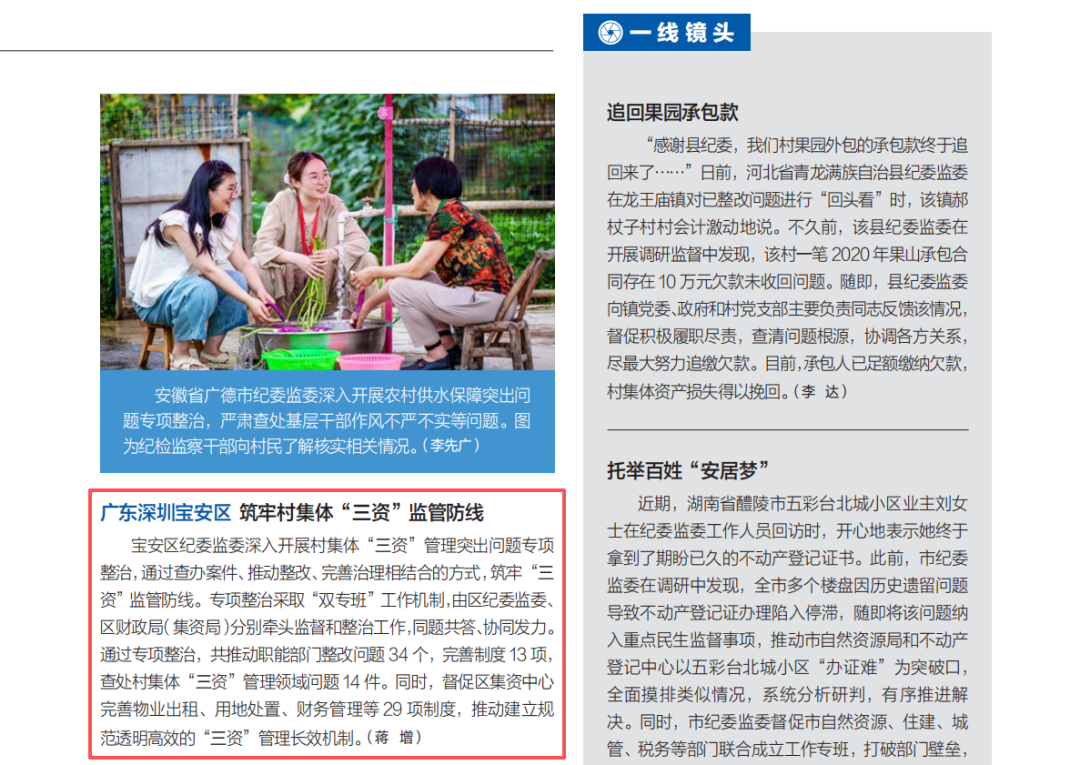 近日,《中国纪检监察》杂志(2025年第20期)“广角”栏目刊发文章《广东深圳宝安区 筑牢村集体“三资”监管防线》,关注报道宝安区纪委监委深入开展村集体“三资”管理突出问题专项整治,通过查办案件、推动整改、完善治理相结合的方式,筑牢“三资”监管防线。具体内容如下: